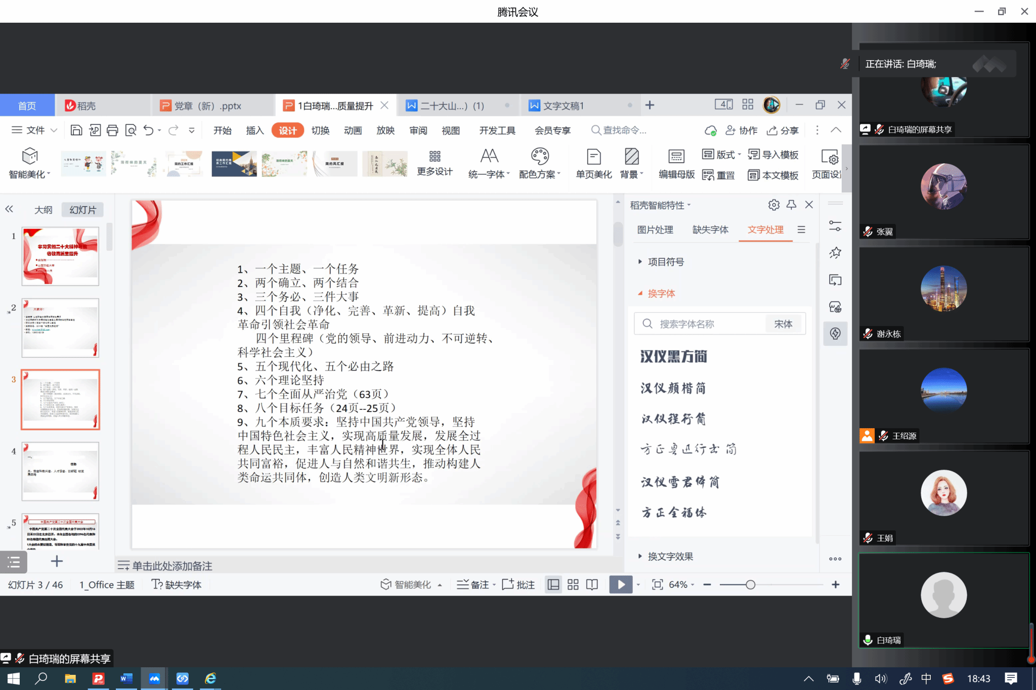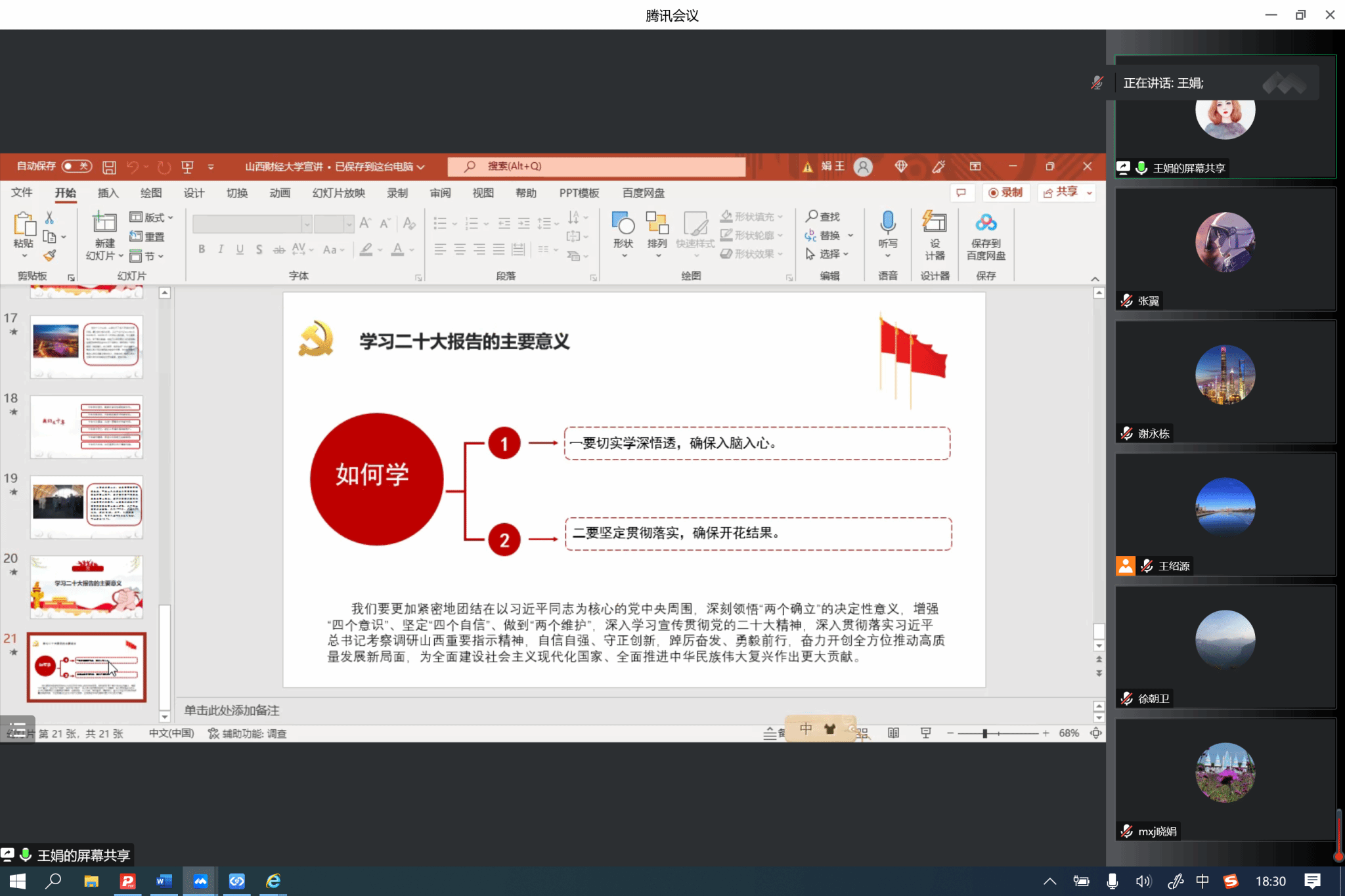 王娟老师、白琦瑞老师分别就开展党的二十大精神宣讲的核心理念、内容要点、手段依循、方法依托等方面进行了导学。在此基础上,与会成员集中围绕学习阐释党的二十大精神这一主题,在宣讲内容、宣讲形式、宣讲方法等方面达成了思想共识,为接下来宣讲活动的开展奠定了坚实基础。