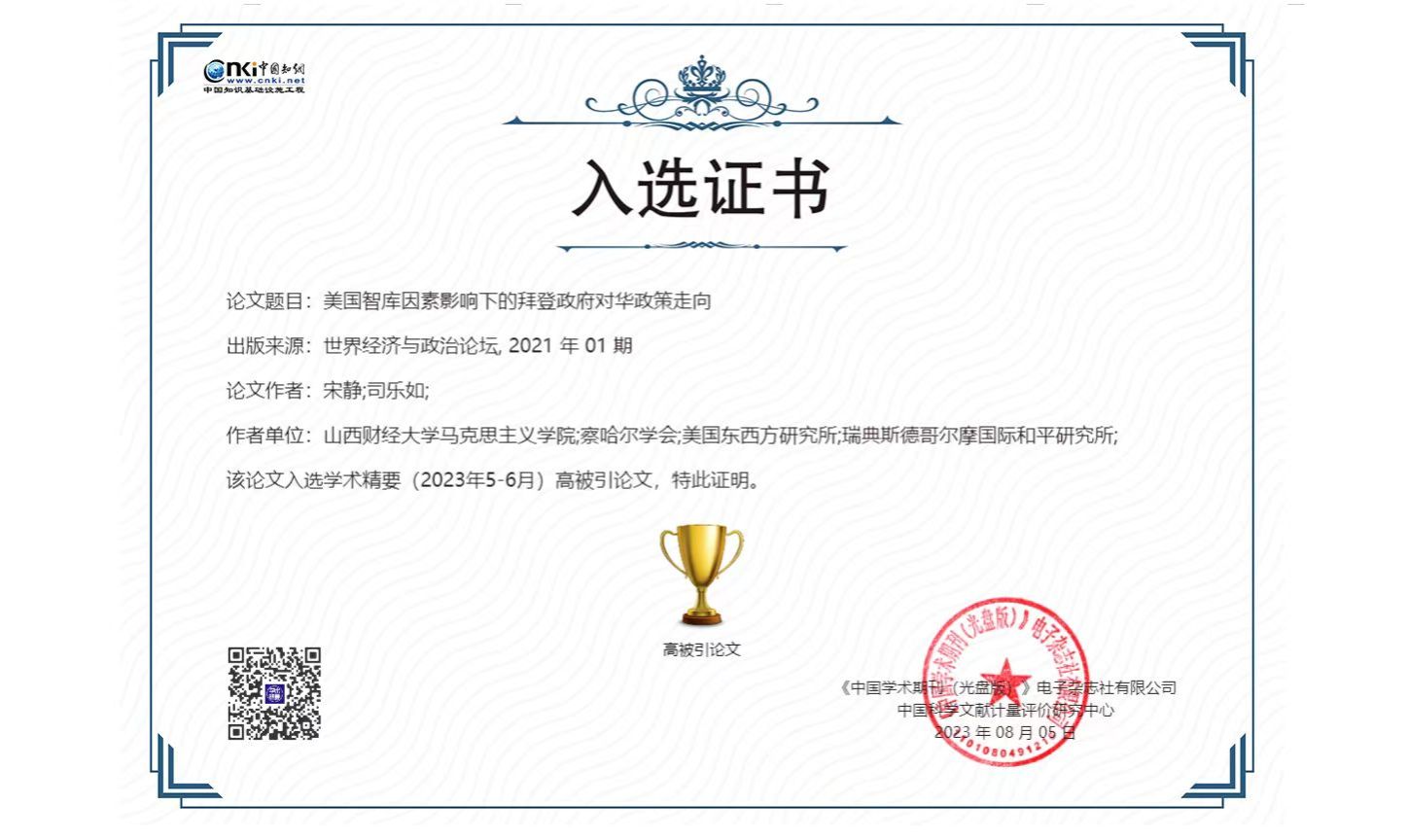 JJ斗地主app宋静老师于2021年1月发表在《世界经济与政治论坛》(CSSCI)的论文《美国智库因素影响下的拜登政府对华政策走向》,成功入选中国知网《学术精要数据库》2023年7-8月高影响力论文。此文系宋静老师主持的2019年国家社会科学基金后期资助项目(编号:19FGJB008)的子课题,并被《上海社会科学文摘》全文转载。转引期刊包括《当代亚太》《和平与发展》《东北亚论坛》《同济大学学报》《台海研究》《世界经济与政治论坛》《人民论坛》《国际贸易》《情报杂志》《智库理论与实践》《南亚东南亚研究》等。