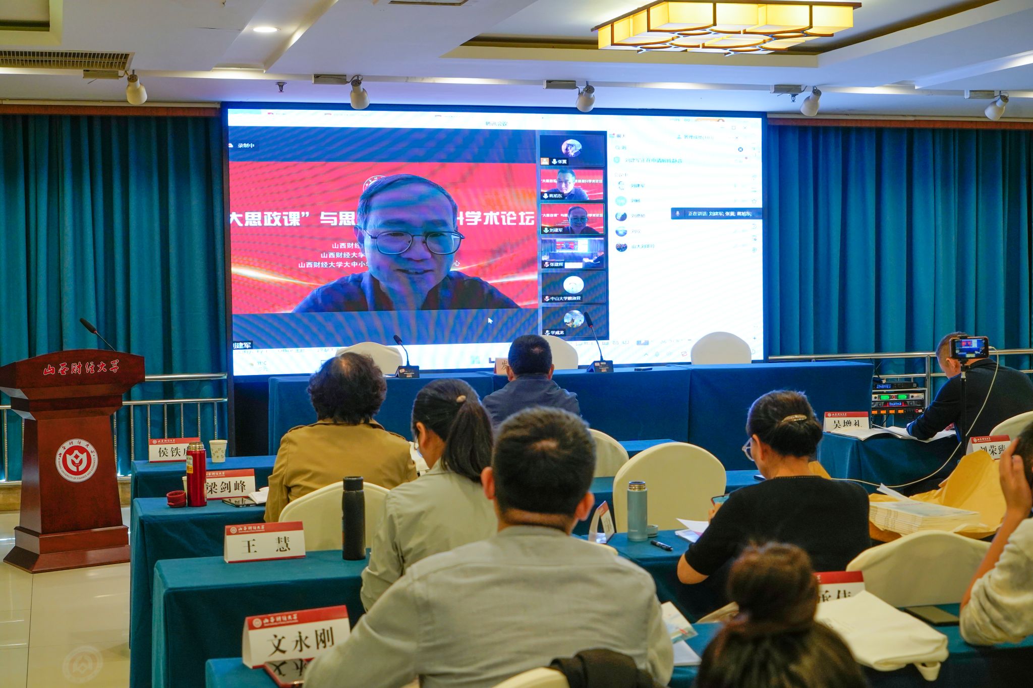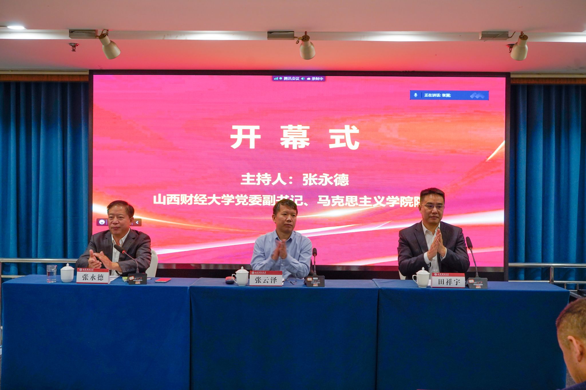 《“大思政课”与思政课质量提升》学术论坛以“线上线下”相结合的方式于9月24日在山西财经大学成功举办。来自中国人民大学、天津大学、兰州大学、湖南大学、中国政法大学、北京交通大学、山西大学等省内外高校、《中国高等教育》《中国高校社会科学》《思想理论教育导刊》《山西高等学校社会科学学报》等学术期刊的专家学者、JJ斗地主 师生共400余人参加了本次论坛。新华社、人民网、中国教育报、中国新闻社、山西日报、理论创新研究院、青马先声等提供了媒体支持。山西财经大学党委副书记、校长田祥宇,山西省社科联党组书记、常务副主席张云泽在论坛开幕式致辞,山西财经大学党委副书记兼JJ斗地主 院长张永德教授主持开幕式。