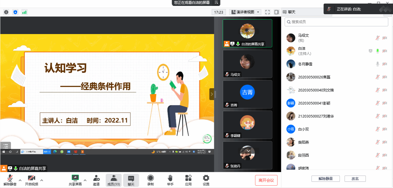 为了培养研究生良好的学习习惯,树立正确科学的世界观、人生观和价值观,激发学生们的积极性和主动性,提高其思想道德素养。 11月1日晚由吉菁副教授主持,白洁副教授主讲的《认知学习——经典条件的作用》通过腾讯会议在线上举行。