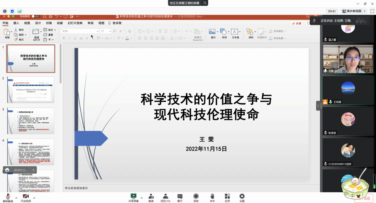 在本次活动中,王雯老师以“科学技术的价值之争与现代科技伦理革命”为题展开了学术分享。首先,从“科学技术的价值之争”入手介绍了各个学者对于科技和价值的概念界定,并引出科技价值中立论和科技价值关联论;其次,系统论述了科技价值与科技伦理关联的六种观点,详细介绍科技伦理面临的问题和产生的原因;最后,宏观指出现代科技伦理的两大使命,并就科技伦理对于当今社会的重要意义进行了总结。