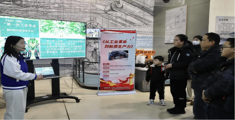 2月15日上午,在山西省科学技术馆“机器与动力”展厅,宣讲团成员李小艺同学带来了以“从工业革命探秘新质生产力”为主题的首场思政课堂。她以三次工业革命为线索,聚焦近年来国内科技领域的伟大成就,由浅入深地介绍了人工智能大模型等科技创新实例,揭示了以科技创新引领新质生产力发展的重要性,深入浅出的讲解赢得了现场观众的阵阵掌声。