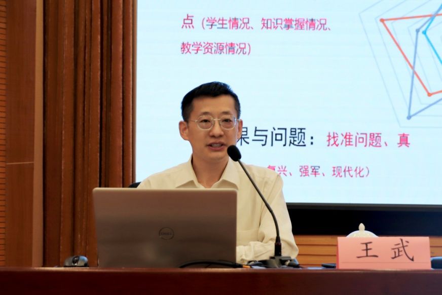 在专题辅导过程中,王武副教授认为思政课教学竞赛不仅是教师展示教学能力的舞台,更是推动思政课教学改革、促进专业成长的重要抓手。他结合自身参赛经验,以“备赛—参赛—研赛”作为主轴,重点聚焦学情分析报告的撰写、教案的设计、教学课件的凝练和说课视频的录制等重要环节开展辅导交流。他表示,思政课教学要立足强化问题意识,以“巧妙的问题导入+幽默风趣的语言表述+严密的逻辑推理”为依循,做到“开头巧、主线清、内容实、形式美、案例近、总结妙”,进而将抽象理论转化为学生可感知、可参与、可践履的生动实践。