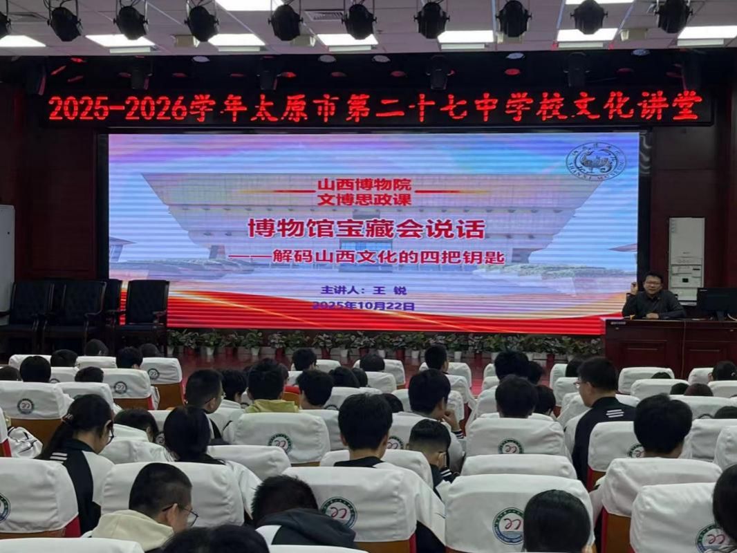 教师王锐以山西省博物院的多件镇馆之宝为线索,从山河钥匙:黄土与大河的塑造、根祖钥匙:华夏文明的“基因实验室”、匠心钥匙:传统技艺的活态传承、烟火钥匙:饮食里的生活哲学共四个方面为二十七中学校的约200名师生解读了山西文化的深刻内涵,得到了在场师生的广泛好评。
