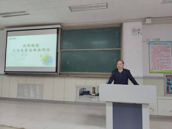 沈沛龙结合当前环境污染和治理效果的实际,从“面临问题——构建共同体过程中的现实困难”、“中国方案——推动构建人与自然生命共同体”、“中国担当——做全球环境治理的行动派”三个部分进行讲授。首先,从人与自然深层次的矛盾日益凸显,国际社会不稳定、不确定因素增多两个方面对我国建立共同体的挑战进行了分析,并对气候变化加速、生物多样性丧失、荒漠化加速、逆全球化的思潮、大国博弈等问题进行了阐述。其次,从“坚持人与自然和谐共生,坚持绿色发展,坚持系统治理,坚持以人为本,坚持多边主义,坚持共同但有区别的责任原则”等六个“坚持”对“构建人与自然生命共同体的中国方案”进行了深层次的解读。最后,结合山西发展实际,从“中国坚持不懈推动绿色发展,深入实施碧水保卫战,打好碳达峰、碳中和硬仗,积极参与全球环境治理,担当发展引领的作用”等方面对“中国做全球治理的行动派”进行了详细解析。